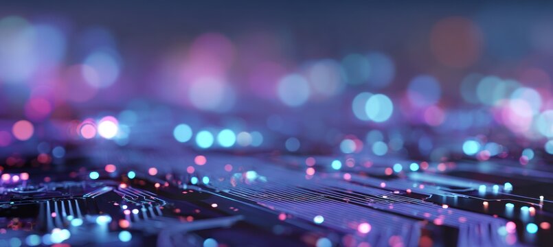 Glowing circuit board traces with colorful abstract bokeh lights background