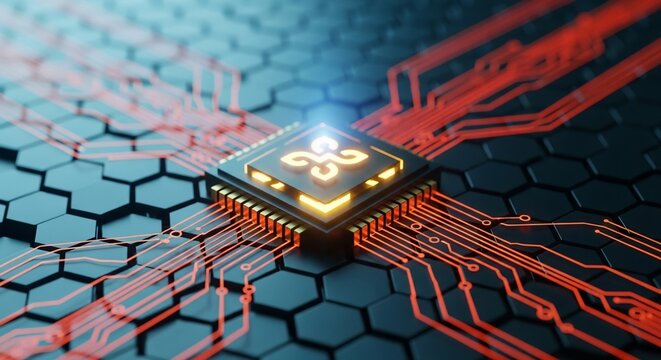 Modern microchip glowing with vibrant orange circuits on a dark hexagonal background, symbolizing innovation