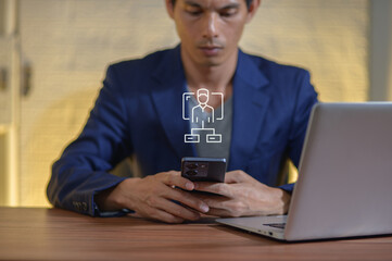 Businessman selecting virtual screen with digital strategy icons,showing decision making,project management,teamwork and analytics tools in a futuristic office environment