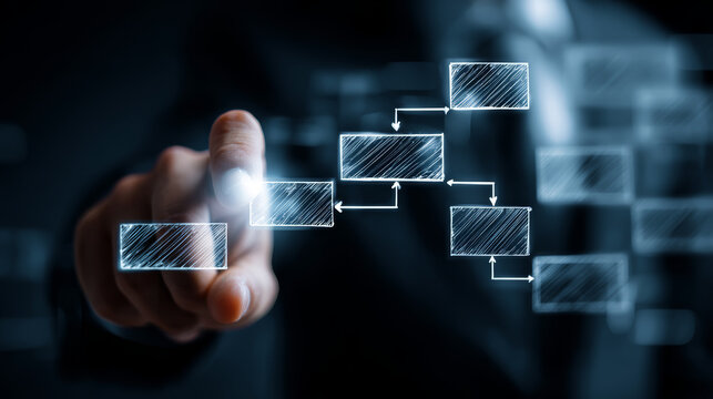 Businessman hand touch flowchart diagram technology, digital process workflow management concept, modern corporate planning interface