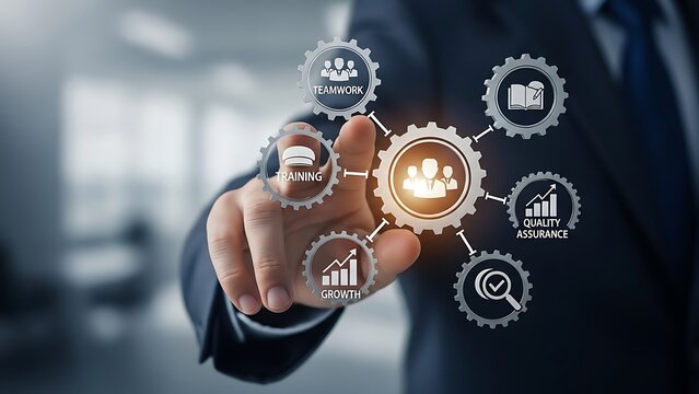 Businessman Interacting with Digital Gears Representing Business Processes and Quality Assurance.