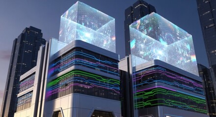 Futuristic Cityscape With Glowing Data Cubes And Modern Architecture