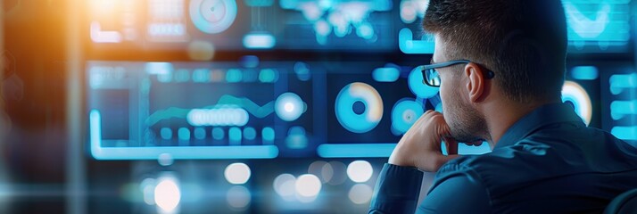 A man closely analyzing digital data on multiple screens. The futuristic interface displays complex graphs and numbers, symbolizing innovative technology and big data analysis.