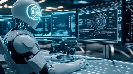 Advanced Robotic System Analyzing Data on Multiple Screens  Artificial Intelligence Technology Future Innovation