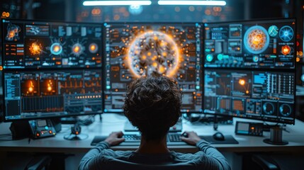 Man Analyzing Data on Multiple Screens in Futuristic Control Room for Technology and Innovation