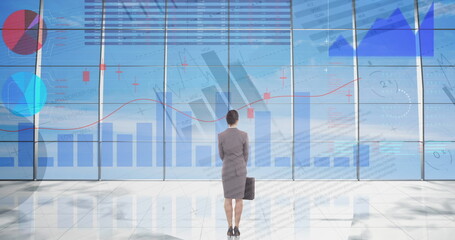 Image of statistical data processing over diverse businessman businesswoman discussing at office