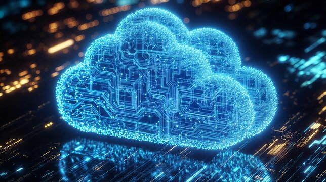 Digital network cloud computing over data server room. Futuristic technology concept of global data storage, transfer, and processing solution for business.