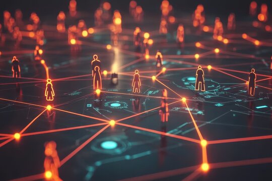 Network of connections illustrated with people icons and data points in a digital landscape, netwrok of connections with people icons and data processing over computer servers