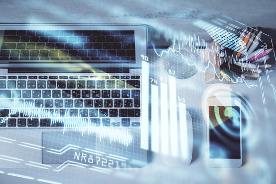 Technology hologram drawing over computer on the desktop background. Top view. Double exposure. Tech concept.