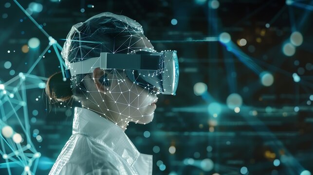 Image of data processing over female scientist with virtual glasses digital composite multiple exposure global abstract and technology concept : Generative AI