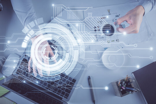 Technology hologram drawing over computer on the desktop background. Top view. Double exposure. Tech concept.