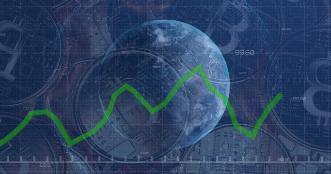 Network of connections and data processing intertwining across a dark background with vibrant green and yellow hues, globe and data processing over network of connections