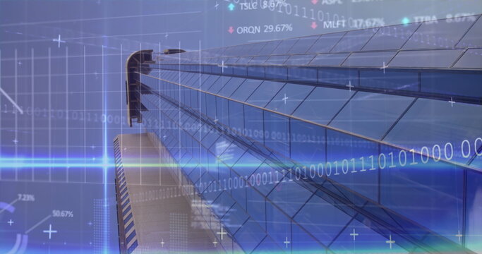 Image of financial data processing over modern building and cityscape