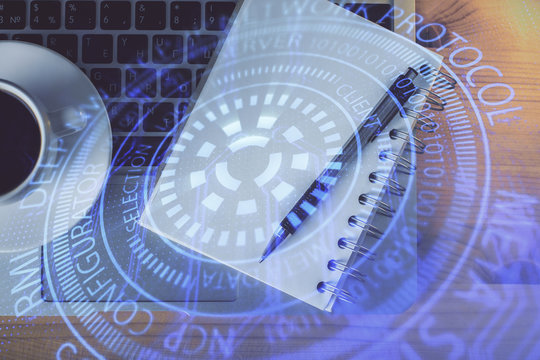Technology hologram drawing over computer on the desktop background. Top view. Double exposure. Tech concept.