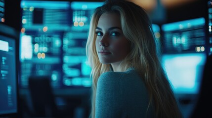 Beautiful woman looks over her shoulder toward the camera