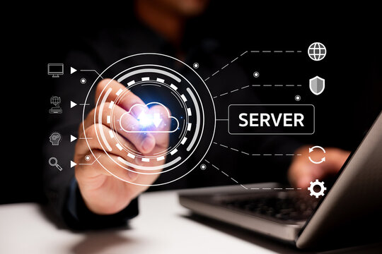 A person interacts with a digital interface highlighting cloud computing and server technology over a laptop in a futuristic tech setting.