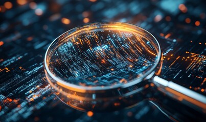 Magnifying glass over glowing digital code.