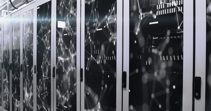 Image of network of connections and data processing over server room