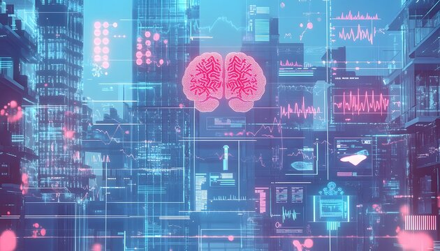 Futuristic Cityscape Brain Data Overlay Visualization