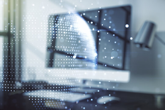 Abstract creative digital world map on modern computer background, globalization concept. Multiexposure