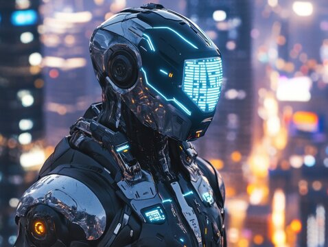 Cybernetic Sentinel: A futuristic, sleek robot stands guard, its illuminated visor displaying complex data, overlooking a cityscape, symbolizing technological advancement and artificial intelligence.