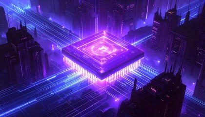 Illuminated processor dominates futuristic cyberpunk cityscape