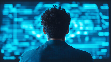 Caucasian male technician analyzing data on futuristic digital interface in server room, blue tones, technology concept. Copy space.