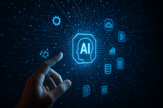 Futuristic digital interface displaying artificial intelligence icon with neural circuit patterns and data integration elements in glowing blue tones