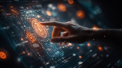 Hand interacting with a modern interface for digital transformation and metaverse concept. Connection of next generation technology and a new era of innovation.
