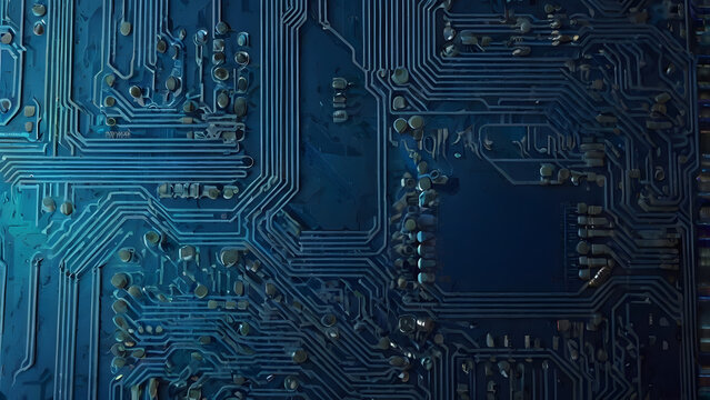 Intricate blue circuit board close-up revealing complex electronic pathways and microchip components, symbolizing advanced technology and digital data processing