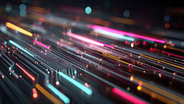 A close-up of a circuit board with colorful light streaks and bokeh effects