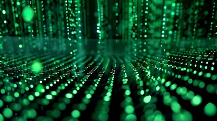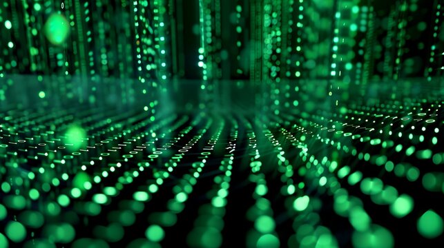Binary code rain digital background with falling green digits. Data stream technology concept for cybersecurity and programming.