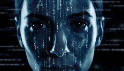 Silhouette of a man with glasses, overlaid with binary code, representing data processing.