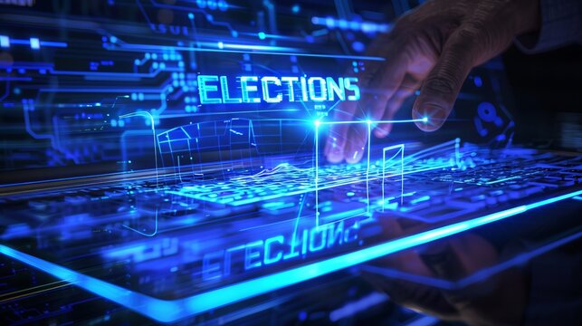 A hand interacts with a high-tech digital interface featuring the word Elections. This innovative display represents the integration of technology in modern voting processes