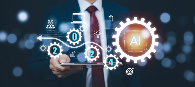 2024 concept, Programmer people working on laptops with AI, artificial intelligence software engineer coding on laptop computers with technology icons and binary code, big data, Ai bot digital machine