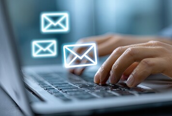 Close-up of a person's hand typing on a laptop, with a glowing checkmark over the keyboard