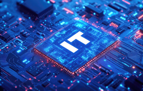 Close-up of a glowing microchip labeled 'IT' on a vibrant circuit board with digital elements
