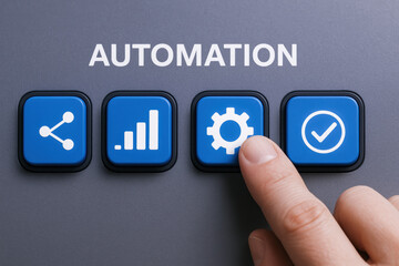 A engages with a control interface featuring blue buttons symbolizing efficiency and process optimization in business automation
