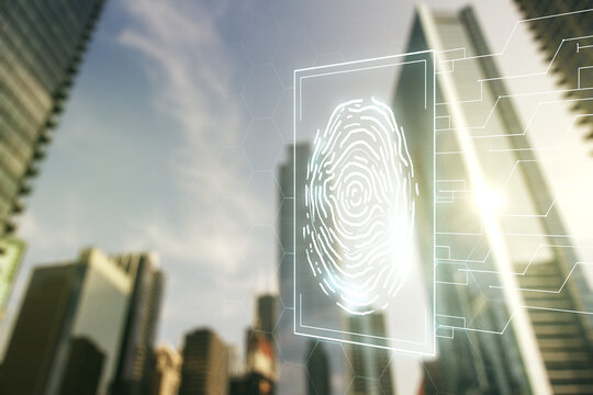 Multi exposure of virtual fingerprint scan interface on Manhattan office buildings background, digital access concept