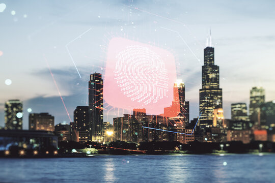 Multi exposure of virtual fingerprint scan interface on Chicago office buildings background, digital access concept