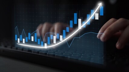 Dynamic stock market graph showcasing a rising trend line with a hand on a keyboard, symbolizing financial growth, investment strategies, and data analysis. Copula