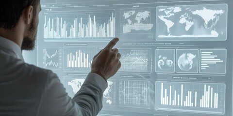 A person analyzing dynamic data visualizations on a modern digital interface, showcasing statistics and global maps.