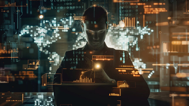 Person engages with a laptop surrounded by complex digital networks and information flows