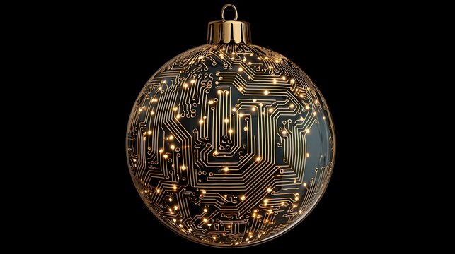Ornate golden Christmas bauble showcasing a circuit board design. Glowing lights. Black backdrop