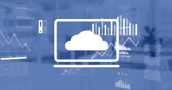 Image of financial data processing with icons over diverse colleagues having meeting in office