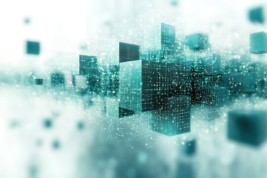 Abstract digital data cubes, interconnected and floating in space.  A visualization of complex networks and information flow.