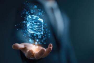 Blue digital cubes with light effects, floating in dark space, creating abstract visual