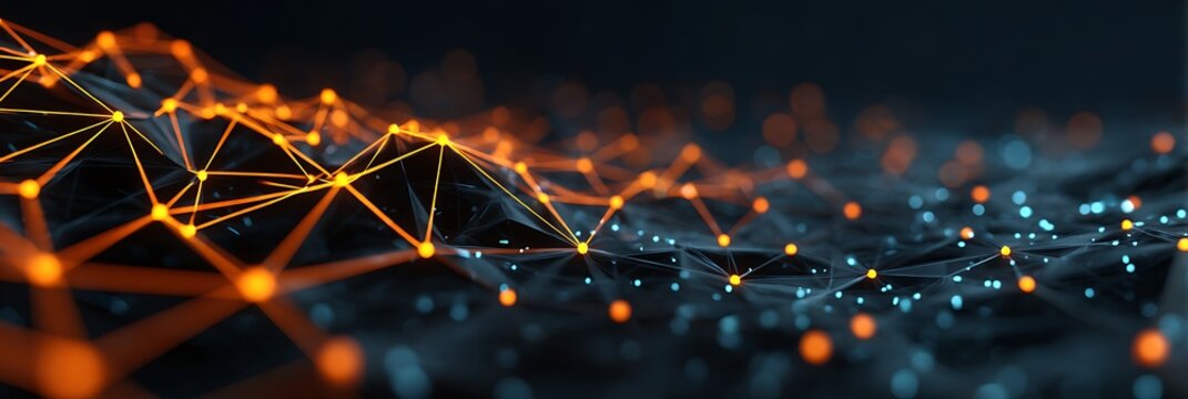 Abstract digital network graphic.  Dark background with glowing network of lines and points,  red highlights on nodes,  and geometric shapes, floating above a grid pattern