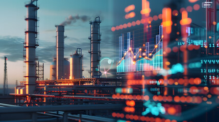 Oil refinery with digital data overlay and industrial equipment..