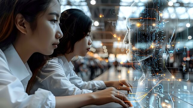 Women working on computers with a digital overlay of an AI figure, symbolizing artificial intelligence, technology integration, and data processing. Ideal for themes of AI, innovation